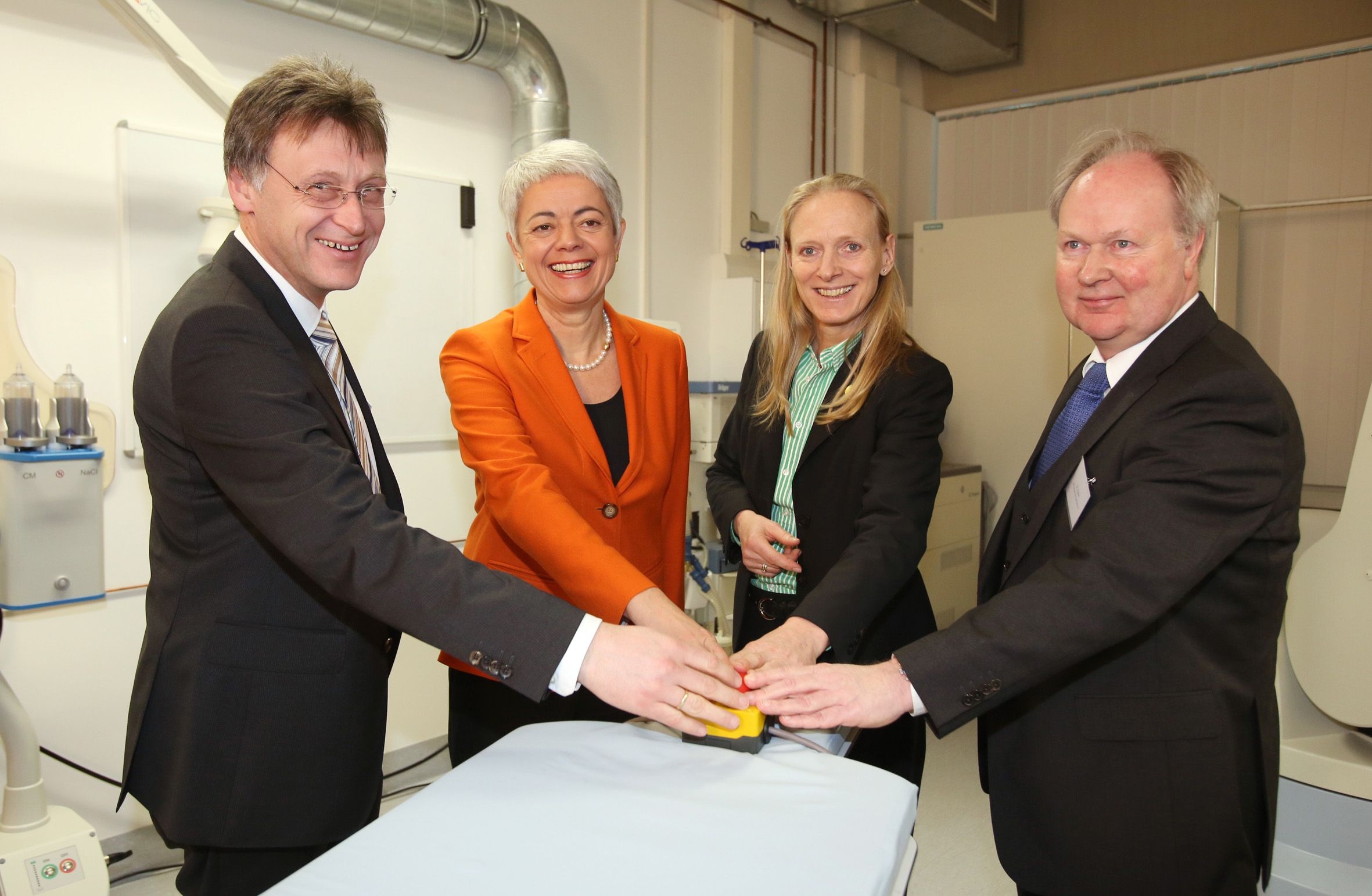Mit einem symbolischen Knopfdruck des Rektors der Otto-von-Guericke-Universität Magdeburg, Prof. Dr.-Ing. Jens Strackeljan, der Staatssekretärin Cornelia Quennet-Thielen vom Bundesministerium für Bildung und Forschung, der Wissenschaftsministerin des Landes Sachsen-Anhalt, Prof. Dr. Birgitta Wolff, und Dr. Heinrich Kolem, CEO AX Division der Siemens AG Healthcare, (v.li.n.re.) startete das interdisziplinäre Forschungsvorhaben STIMULATE (Solution Centre for Image Guided Local Therapies). Foto: Viktoria Kühne/OVGU |
