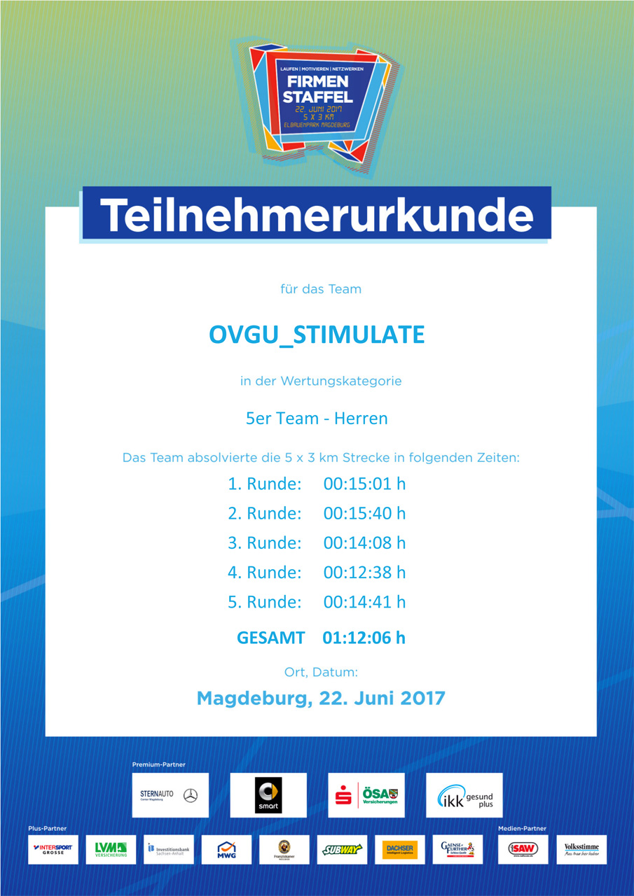 Trotz der Verschiebung auf den 23.06.2017 kamen mehr als 5.000 Teilnehmer und Besucher in den Elbauenpark zum 9. Magdeburger Firmenstaffellauf. Aufgrund des Unwetters am Donnerstag wurde die Veranstaltung um einen Tag verschoben. Die Läufer absolvierten fünfmal eine Drei-Kilometerstrecke durch den Magdeburger Elbauenpark. Dabei ging es vorbei am Jahrtausendturm und entlang des Pappelsees. Unter den rund 2.500 Läufern war auch der Forschungscampus STIMULATE erfolgreich mit zwei Teams am Start.