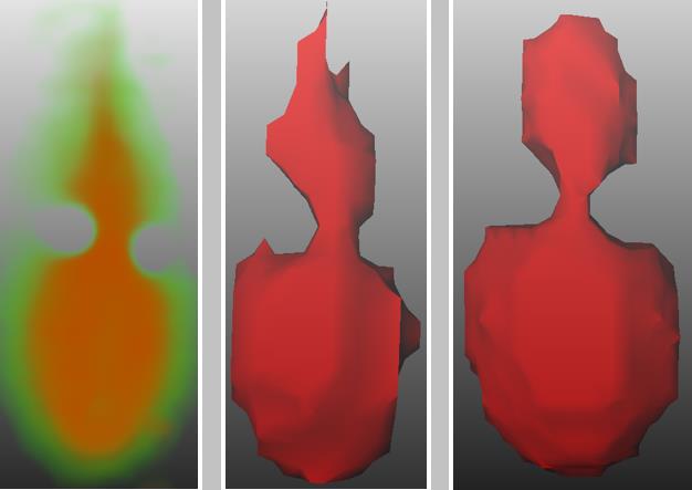 Der Beitrag stellt die mathematische Rekonstruktion der volumetrischen Wärmekarte und einer geeigneten Pilotstudie an 13 ex vivo Bioproteinphantomen mit flexiblen Schläuchen detailliert vor. Die flexiblen Schläuche simulieren dabei einen Kühlkörpereffekt, der in vivo durch die Gewebe-durchziehenden Blutgefäße besteht und sich auf die Hitzeverteilung während der Thermoablation auswirkt. Die Auswertung zeigt vielversprechende Ergebnisse in Bezug auf die Ähnlichkeit der Rekonstruktion im Vergleich zur realen Koagulationsnekrose. Zum Vergleich zeigt die Abbildung links die Wärmekarte mit einem Wärmegradienten von rot (warm) nach grün (kalt), in der Mitte die aus dieser Wärmekarte berechnete Zone des zerstörten Gewebes und rechts die medizinisch ermittelte, reale Zone des zerstörten Gewebes (Koagulationsnekrose).