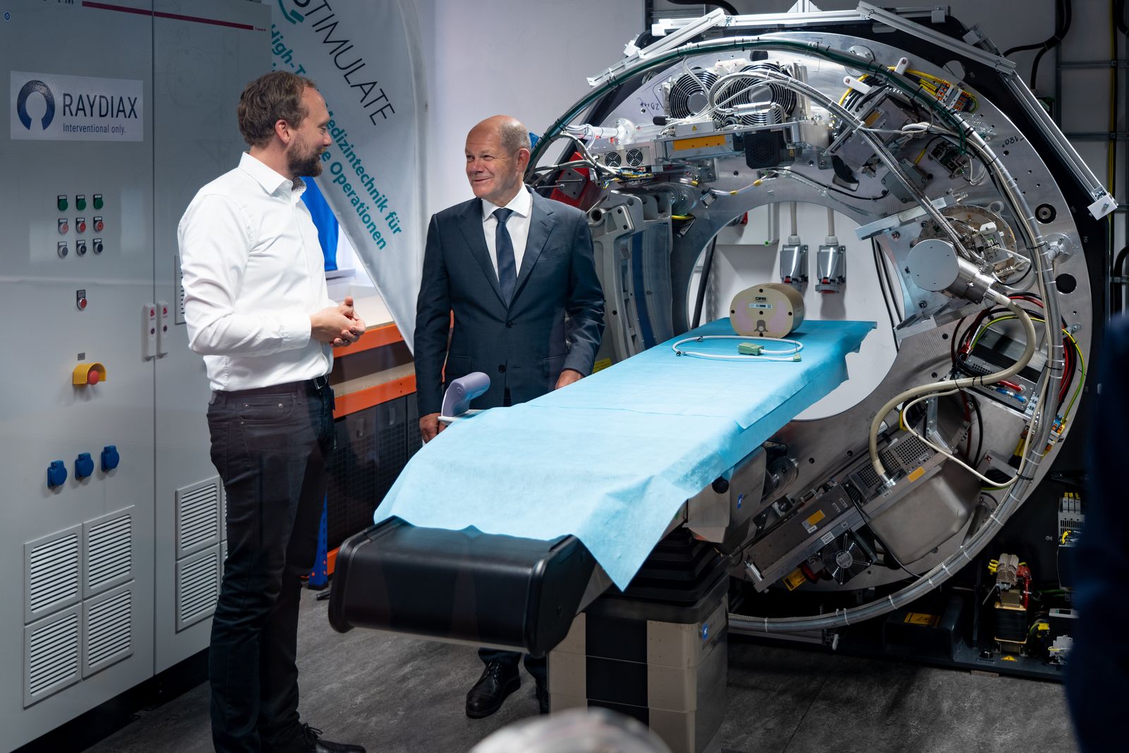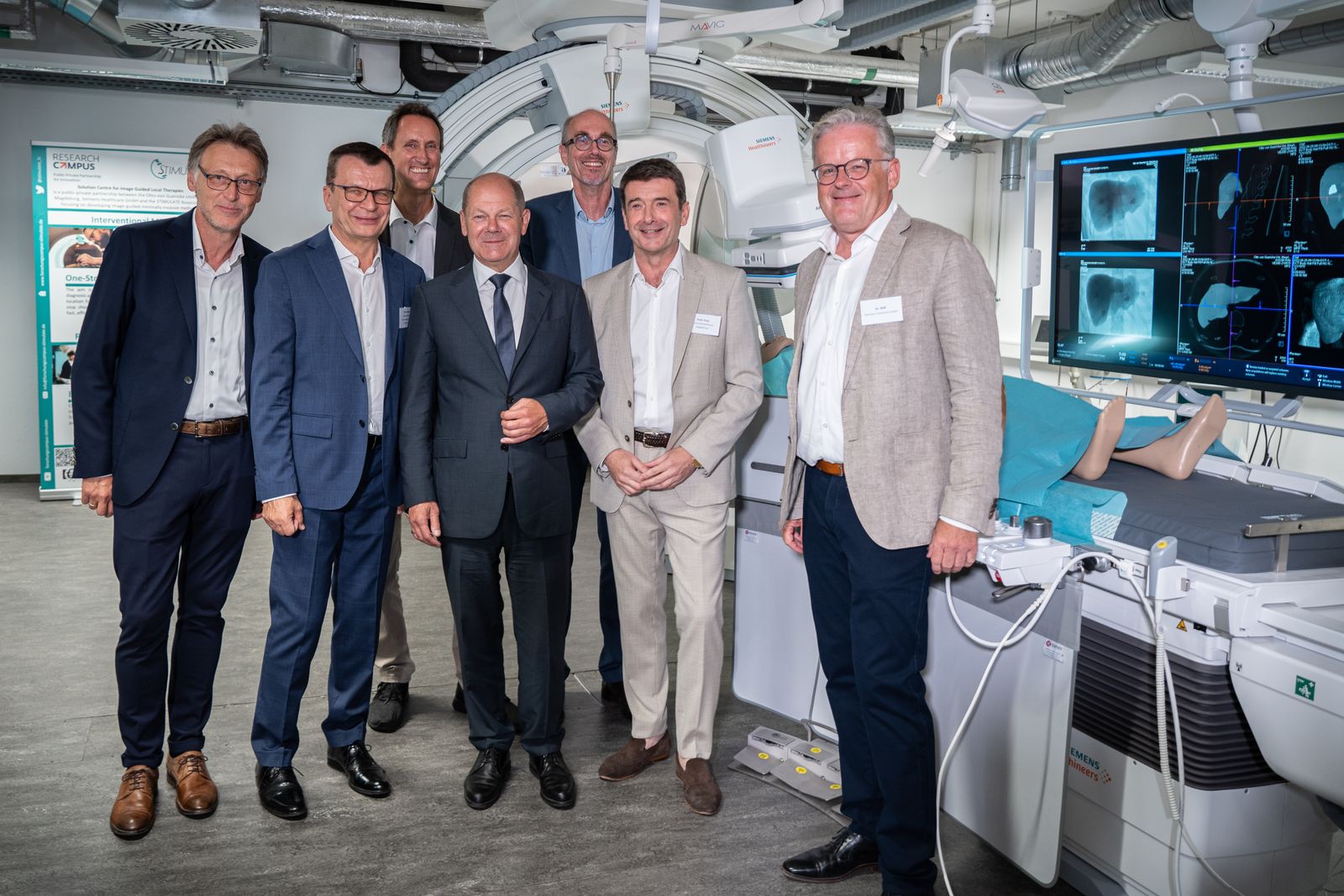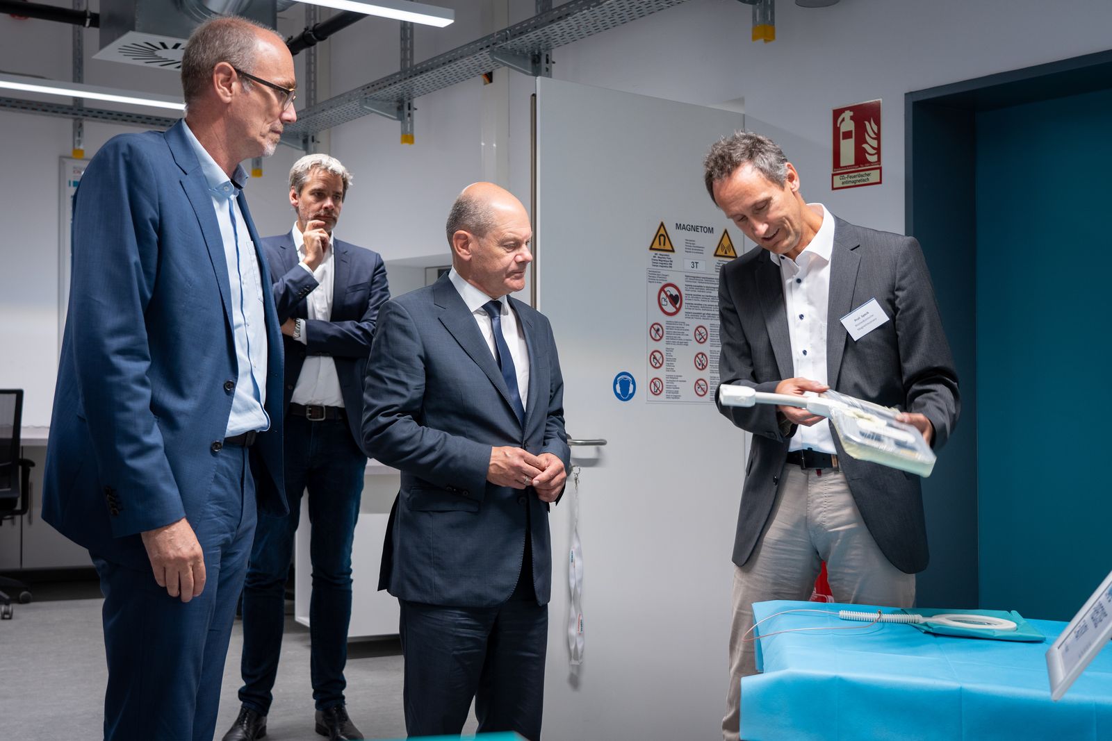 Im anschließenden Rundgang durch ausgewählte Labore des Forschungscampus erhielt der Bundeskanzler Einblicke in die neuste Medizintechnik bildgeführter Therapien und er erfreute sich sichtlich über die vielen Gelegenheiten, einige Geräte selbst zu testen. Im Kontrollraum des Magnetresonanztomographen (MRT) stellten Prof. Speck und Prof. Wacker (STIMULATE-Vorstandsmitglieder der OVGU bzw. der Medizinischen Hochschule Hannover) neuartige interventionelle MR-Spulen sowie ein mikro-robotisches System zur Nadelplatzierung im MRT vor. Der Bundeskanzler versuchte sich dabei an der robotischen Fernsteuerung und platzierte die Biopsienadel erfolgreich in einem Patientenmodell. Beeindruckt zeigte er sich auch von dem Kleinkind-MRT, welches das benachbarte und dem STIMULATE-Verein angehörige Startup Neoscan Solutions GmbH bis hin zur Marktreife entwickelte. Besonders interessiert zeigte sich der Bundeskanzler von den Planungen zur Entwicklung des weltweit ersten humanen 14T MRT durch Neoscan, welche Herr Dr. Röll, der Gründer und Geschäftsführer der Firma, präsentierte. Im Angiographielabor erläuterte Prof. Pech, STIMULATE-Vorstandsmitglied der OVGU, die aktuellen Forschungsarbeiten mit dem Angiographiesystem der neusten Generation vom Partner Siemens Healthineers. Dr. Hoffmann, der Geschäftsführer des kürzlich gegründeten Startups RAYDIAX, präsentierte dem Bundeskanzler Einblicke in den gegenwärtigen Entwicklungsstand eines Therapieassistenz-Computertomographen sowie in die bisherige unternehmerische Entwicklung des STIMULATE-Spin-Offs.