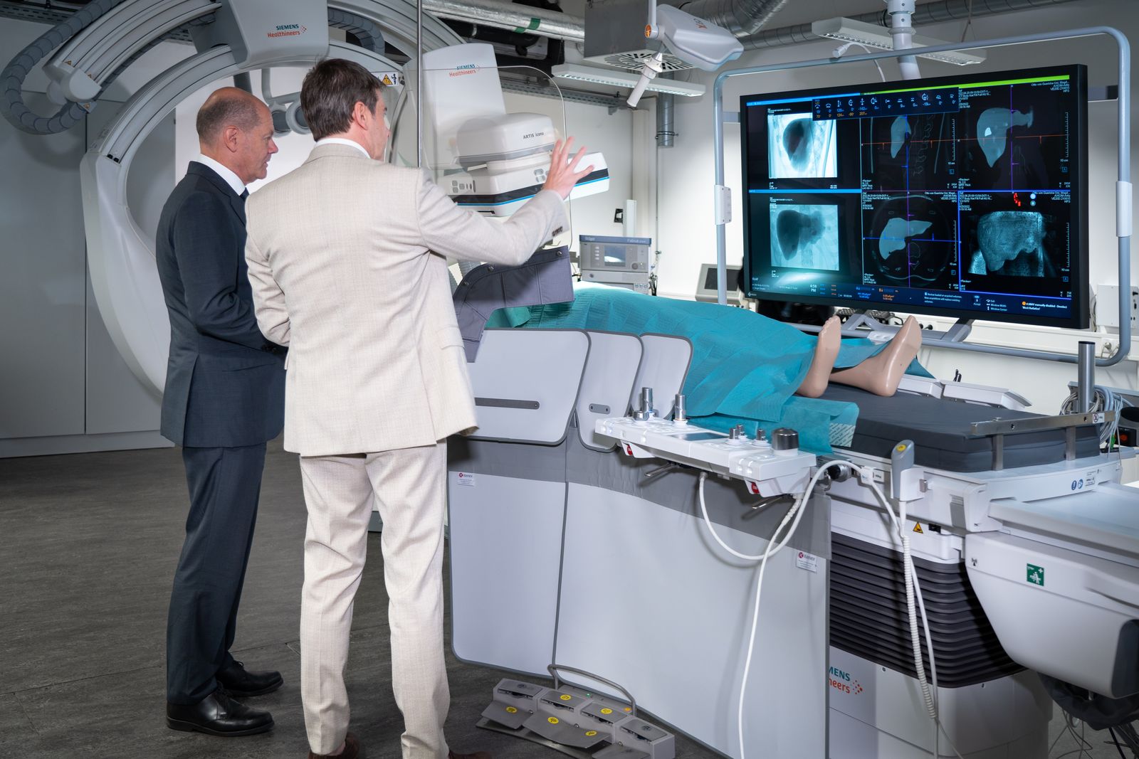During the subsequent tour of selected laboratories of the research campus, the Chancellor gained insights into the latest medical technology of image-guided therapies and he visibly enjoyed the many opportunities to test some of the devices himself. In the magnetic resonance imaging (MRI) control room, Prof. Speck and Prof. Wacker (STIMULATE board members of OVGU and Hannover Medical School, respectively) presented novel interventional MR coils and a micro-robotic system for needle placement in the MRI. The Chancellor tried his hand at robotic remote control and successfully placed the biopsy needle in a patient model. He was also impressed by the infant MRI, which the neighboring startup Neoscan Solutions GmbH, a member of the STIMULATE association, developed to market maturity. The Chancellor was particularly interested in Neoscan's plans to develop the world's first human 14T MRI, which Dr. Röll, the company's founder and CEO, presented. In the angiography laboratory, Prof. Pech, STIMULATE board member of OVGU, explained the current research work with the latest generation angiography system from partner Siemens Healthineers. Dr. Hoffmann, the CEO of the recently founded startup RAYDIAX, presented to the Chancellor insights into the current development status of a therapy assistance computer tomograph as well as the entrepreneurial development of the STIMULATE spin-off.