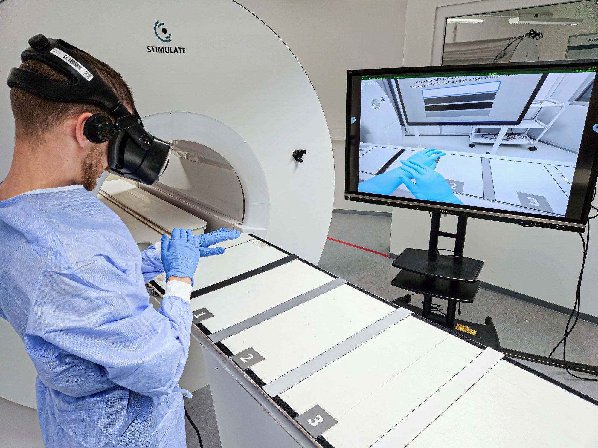 The study design stipulated that each test subject would work with both a low-error and an error-prone system. The allocation was made in random order. One group completed the tasks on the physical MRI mock-up in a realistically recreated MRI room in the usability laboratory. The mock-up corresponded to the original dimensions of a Siemens Free.Max MRI. The comparison group worked entirely in a VR environment. For this purpose, the MRI, rooms and equipment were recreated in 3D using Unity software. Sounds, movement speed and delay were taken from the real mock-up to create identical test conditions. The participants used VR glasses with an integrated hand-tracking sensor to see their hands in the virtual world and perform gestures.