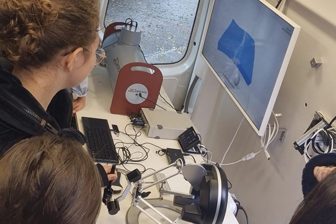 Not only was there a great deal of curiosity on board, but also fascinating technology that demonstrates how innovative and versatile modern medical technology is. In exciting hands-on experiments, the pupils were able to try out for themselves how medical devices work and where they are used in practice. One highlight was the haptic device, which allowed participants to ‘touch’ things that do not actually exist – a force feedback system that makes virtual objects tangible. The students explained how such technologies are used, for example, in surgical training or robot-assisted procedures in medicine. The ultrasound examination experiment then got down to business: using a compact mobile ultrasound device, the young people were able to test on a phantom – or on themselves if they wished – how hidden structures in the body can be made visible. It quickly became clear that recognising the correct structures on the screen is not that easy. This became particularly clear with the optical computer tomograph – a small, radiation-free CT device that generates live 3D images. The pupils were allowed to ‘scan’ a vascular phantom and observe how vascular structures inside it became visible – just like with a large clinical CT system.