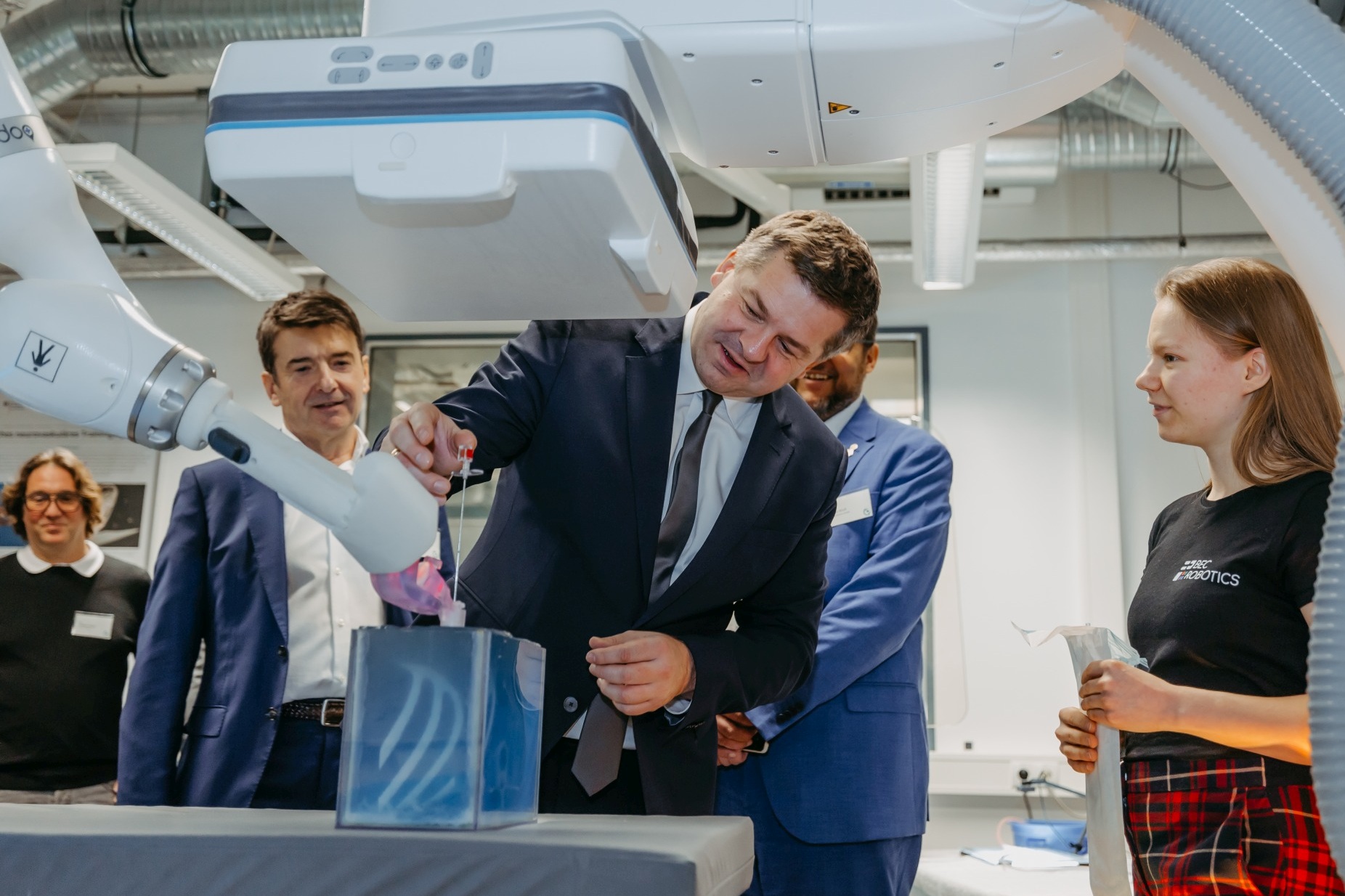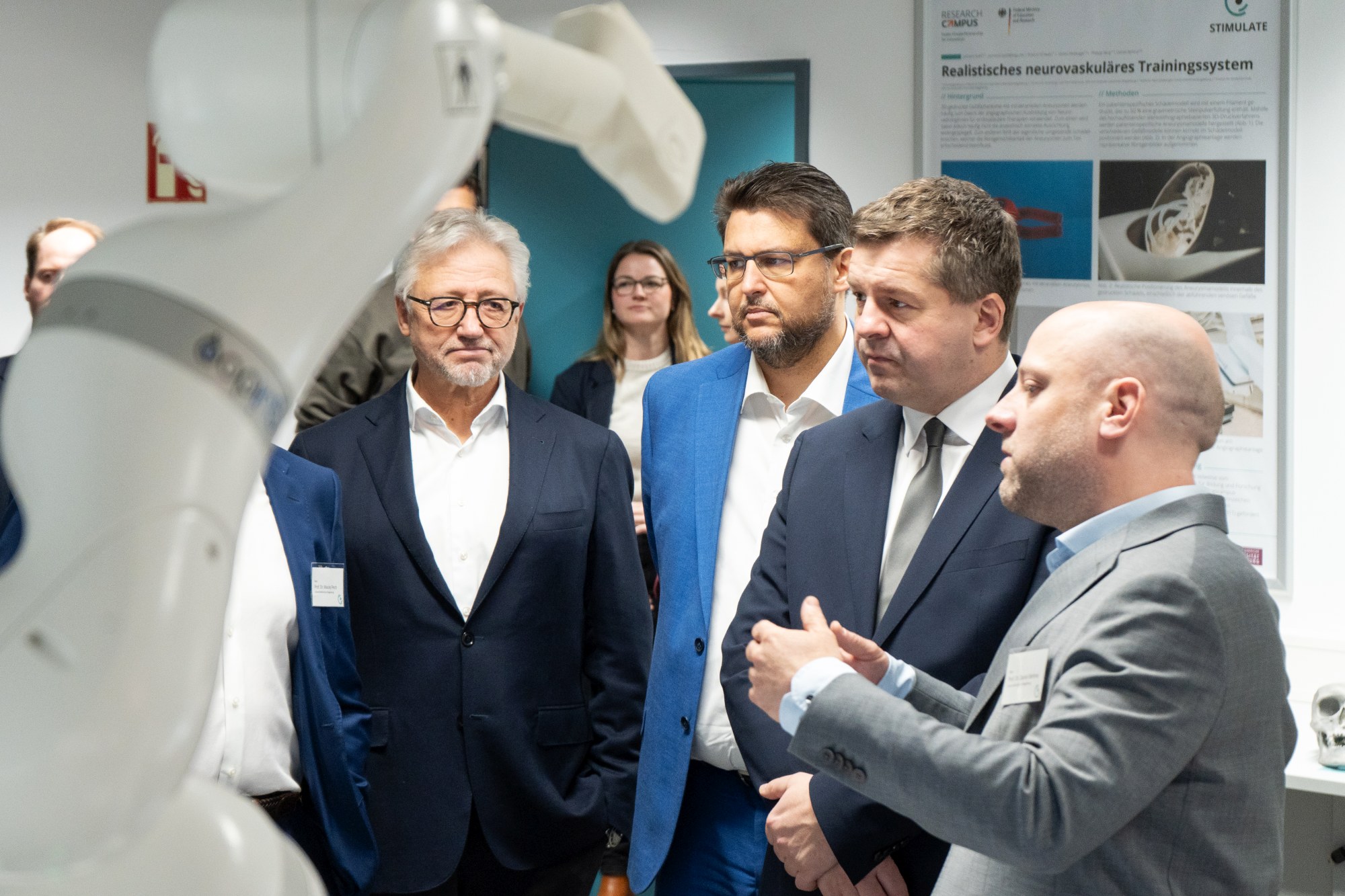 During a tour of the STIMULATE laboratories, guests were able to gain insights into MRI interventions, neurointerventions and robot-assisted procedures. The demonstrations highlighted the close interconnection between research, clinical application and technological development, which establishes STIMULATE as a central platform for innovative medical technology. In the angiography lab, the Minister-President presented an honorary medal to the startup RAYDIAX in recognition of its successful acquisition of European Union EIC Accelerator funding – a special distinction honoring an innovation achievement recognized across Europe.